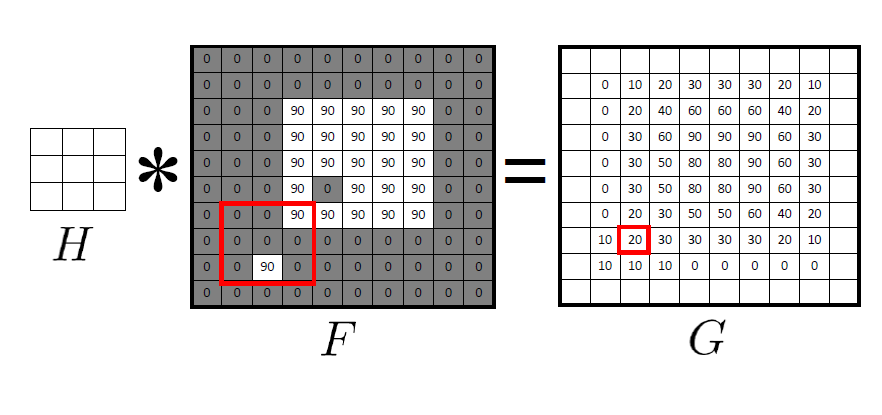 $$G[i, j] = \Sigma^k_{u=-k}\Sigma^k_{v=-k} H[u, v] F[i-u, j-v]$$