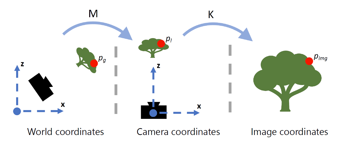 point ($x, y, z$)를 world coordinate에서 camera로 project 시키려면