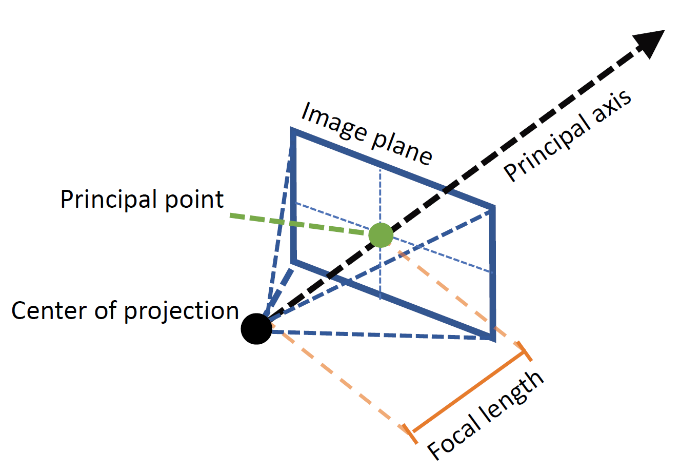 pinhole camera를 geometric model로 표현하면 위와 같습니다. 이미지가 투영되는 COP에서 focal point와 focal length, principal axis를 살펴볼 수 있습니다.