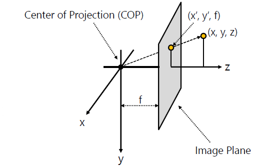 - 원점에 optical center (Center of Projection, COP)을 놓는다