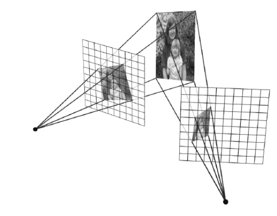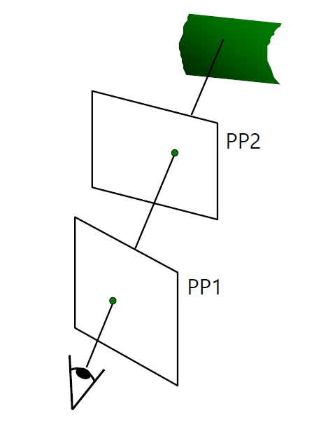 PP1의 각 픽셀을 통해 ray를 투사시키고, 해당 ray가 PP2와 교차하는 픽셀을 그립니다.