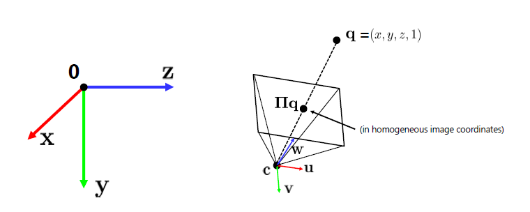 - $K$는 Camera Calibration Matrix로서 카메라 좌표계 상에서 3D point와 그것이 투영되어 얻어진 이미지 면에서의 2D point와의 관계입니다.