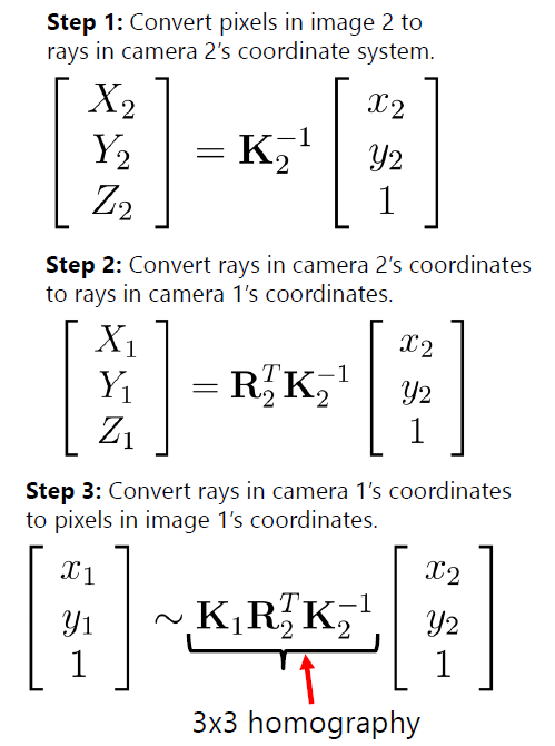 - step1에서 이미지 2의 픽셀을 카메라 2 좌표계의 ray로 변환해야 합니다. 따라서 이미지 2의 intrinsic parameter인 $K_2$의 역변환을 곱하는 형태를 가집니다.