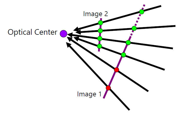 - step3에서 카메라 1 좌표계의 ray를 이미지 1 좌표계의 픽셀로 변환해야 합니다. 이미지 1의 intrinsic parameter인 $k_1$을 곱한 형태로 가집니다.