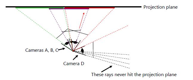왼쪽 이미지는 앞을 보고 있고, 오른쪽 이미지는 아래 바닥을 보고 있습니다. 오른쪽에 보이는 검은색 공간(black area)은 pixel이 mapping 되지 않습니다. 위와 같은 예시라 볼 수 있습니다.