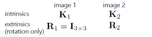 - 이는 카메라의 projection center를 고정시키고 카메라를 일정량만큼 회전 시킨 후에 얻은 이미지를 회전하기 전에 얻은 이미지 사이의 픽셀 대응 관계를 나타냅니다.