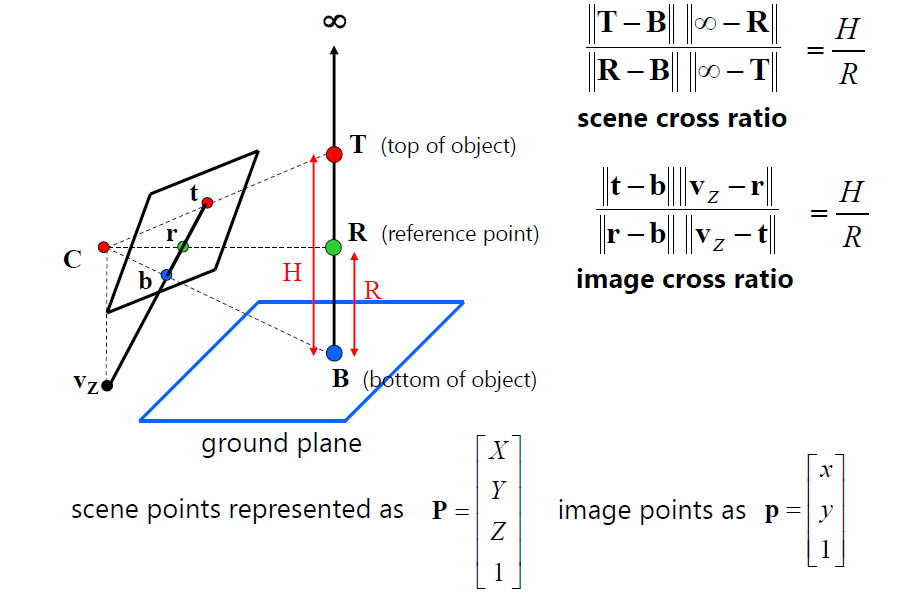 Ground plane 에서 높이를 측정할 때의 예시입니다. Scene cross ratio 와 image cross ratio 는 다음과 같이 동일합니다. projective invariant한 cross ratio가 같은 특성을 이용하였습니다. 동일한 ray 위에 있는 point 이면서 동일한 vanishing point c 로 이어집니다.