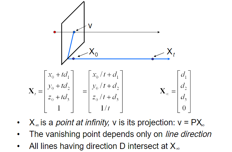 무한대의 점에 투영하는 것 (ideal points in 2D)이라 볼 수 있습니다. 종종 이미지의 유한한 점으로 투영할 수 있습니다. 그런데 항상 그런 것은 아닙니다. (points where parallel lines intersect in 3D)