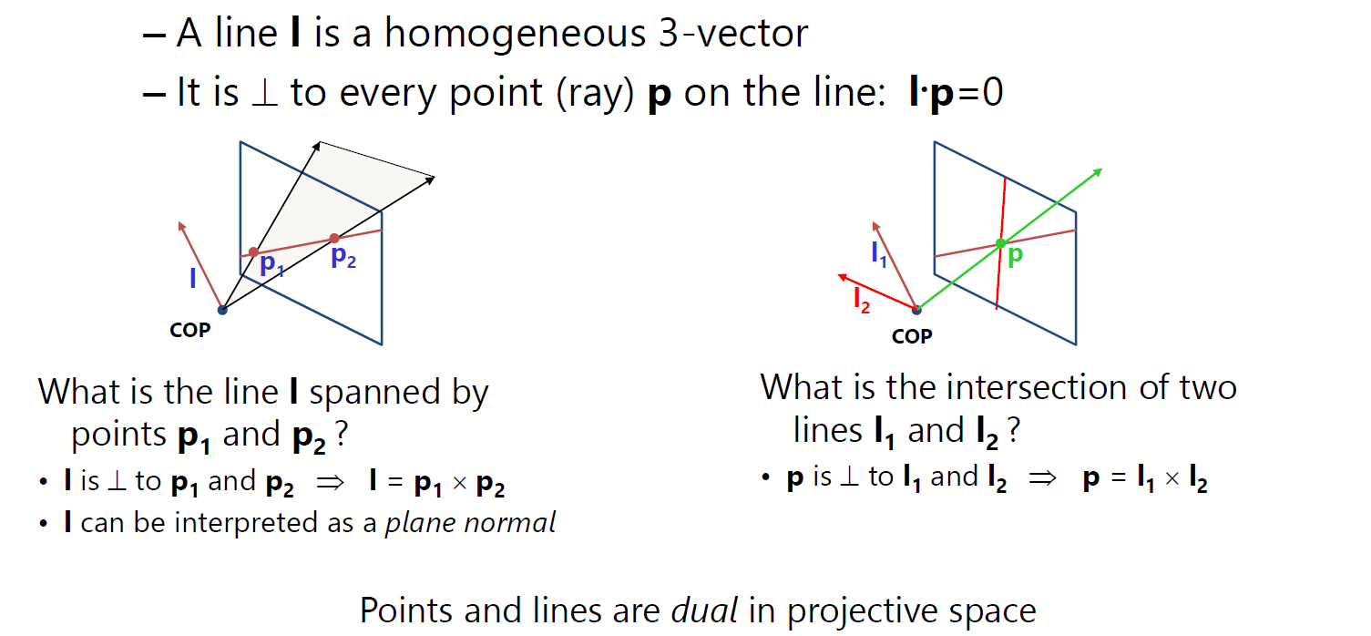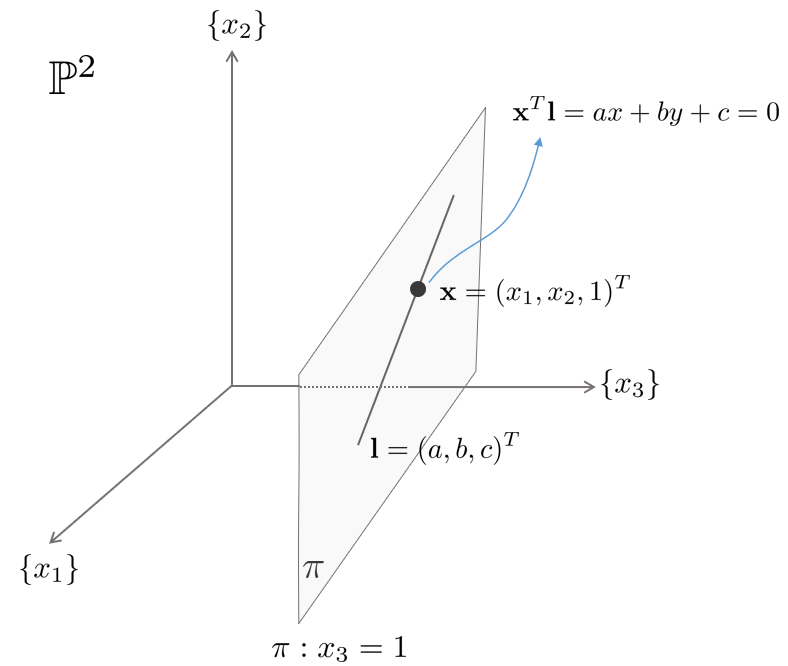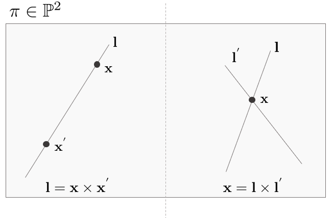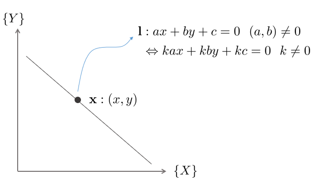 - 직선 $l$ 위에 임의의 한 점 $x=(x,y,1)$이 존재하면 $ax+by+c=0$의 공식에 따라 $l$을 $(a,b,c)$로 표현할 수 있습니다.