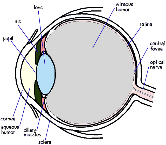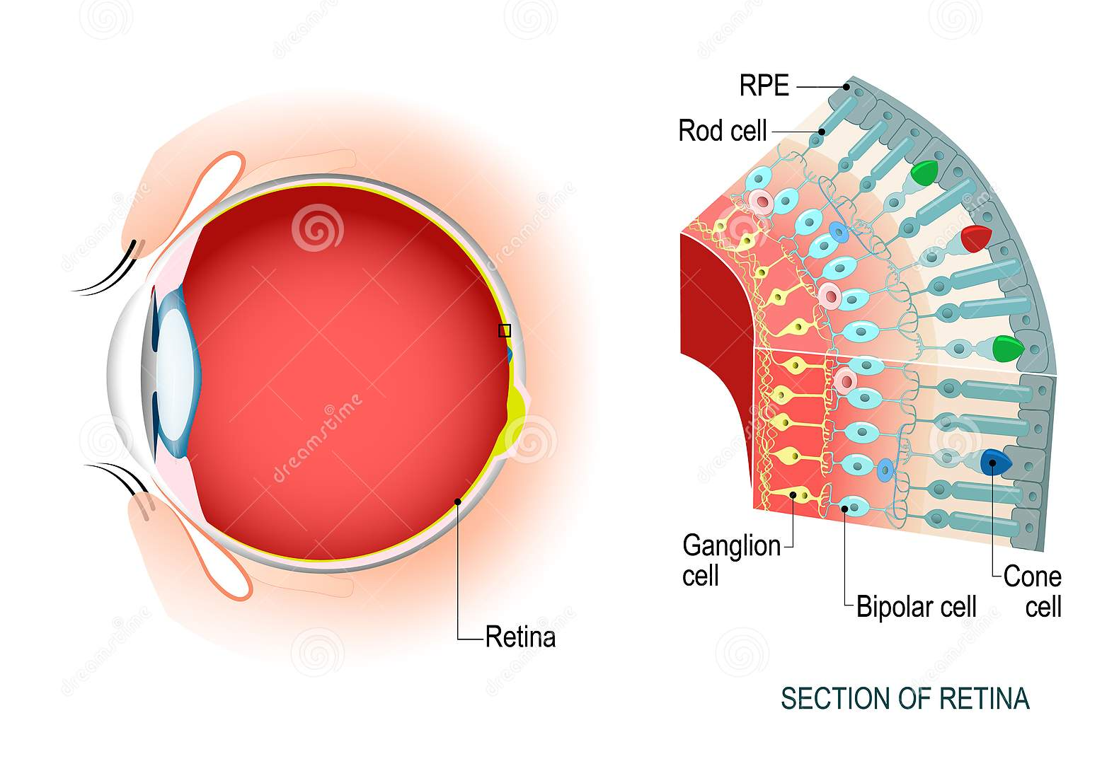 빛은 photosensitive cells을 가진 망막을 통해 들어옵니다.