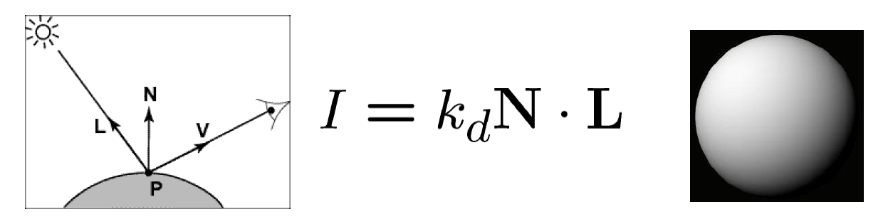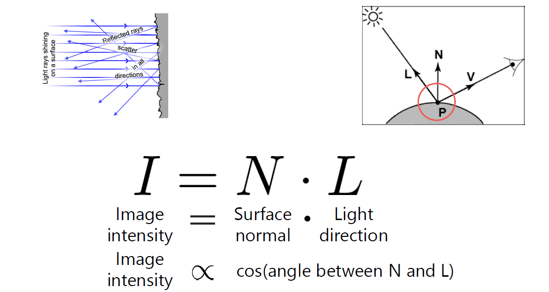 빛이 표면에 반사되어 우리의 눈으로 인식하게 되는 이미지가 있을 때, 그 이미지를 image intensity라고 표현한다면 이는 Surface normal(표면 법선)과 Light direction(빛의 방향)의 곱입니다. 이는 밑에 코사인 법칙으로도 설명되는데 빛이 표면에 반사될 때 만들어지는 각도를 cos이라고 합니다. 빛의 ray는 $L$(빛의 방향), 표면의 법선 $N$이 만드는 각이 cosine이라고 할 때, 이 cosine에 비례한다고 볼 수 있고 이를 Lambert's cosine law(램버트 코사인 법칙)이라 합니다.