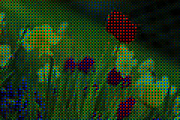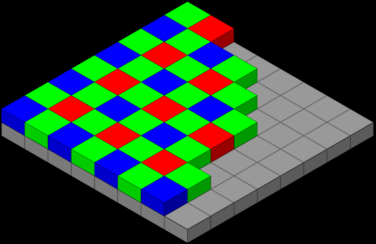 색상이 interpolate 되어 전체 해상도의 demosaicked 된 색상 이미지를 생성합니다.