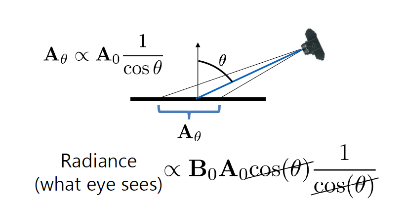 해당 강의의 내용은 여러 가지 개념이 나왔는데 가장 중요한 건 Rrambertian reflectance에 따른 consine law와 그에 따른 개념인 것 같습니다.