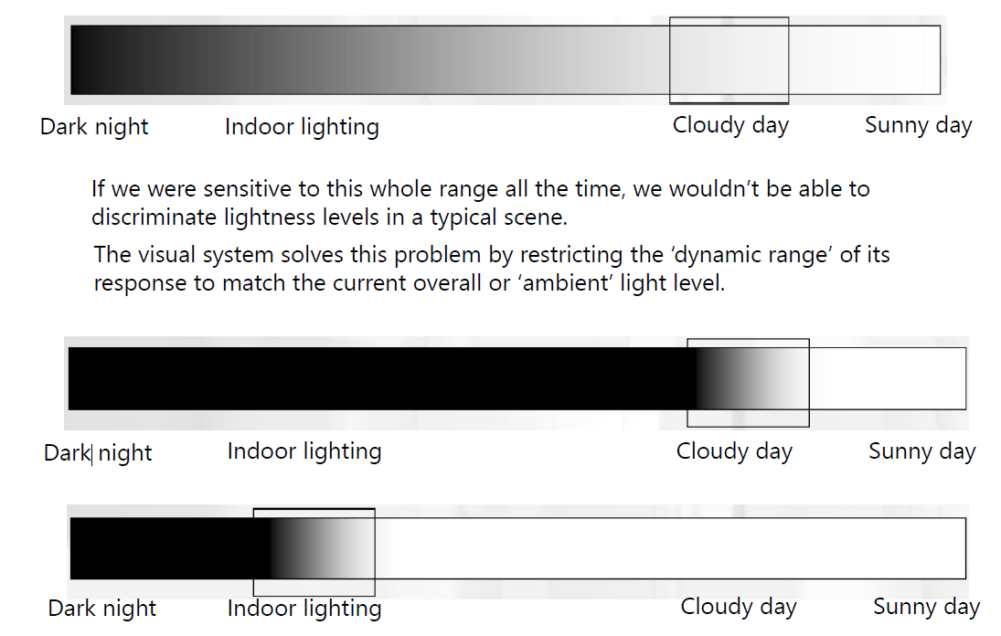 시각 시스템은 현재 전체 또는 주변 조명 수준과 일치하도록 dynamic range를 제한하여 이 문제를 해결합니다.
