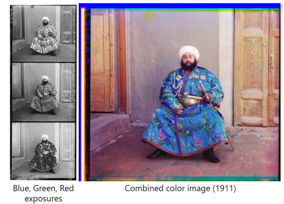 컬러 필름이 발명되기 전 Sergey Prokudin Gorsky는 3개의 다른 color filter를 사용하여 3개의 separate exposures을 수정했습니다.