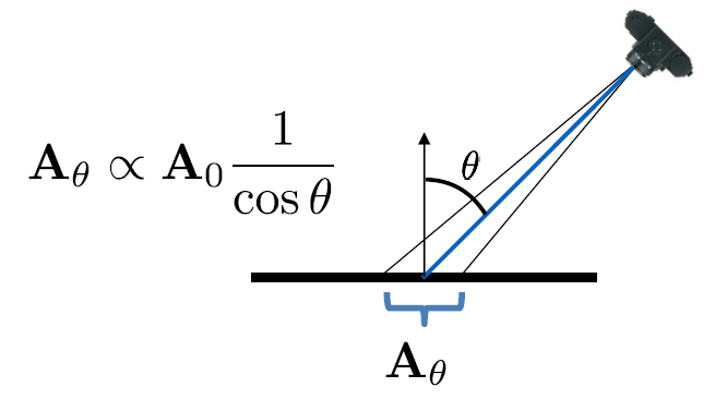 각도 $\theta$에 반사된 광자의 수는 cos($\theta$)에 비례합니다. 그러나 더 큰 각도에서 더 큰 pixel footprint로 인해서 모든 각도에서 모양이 동일합니다.