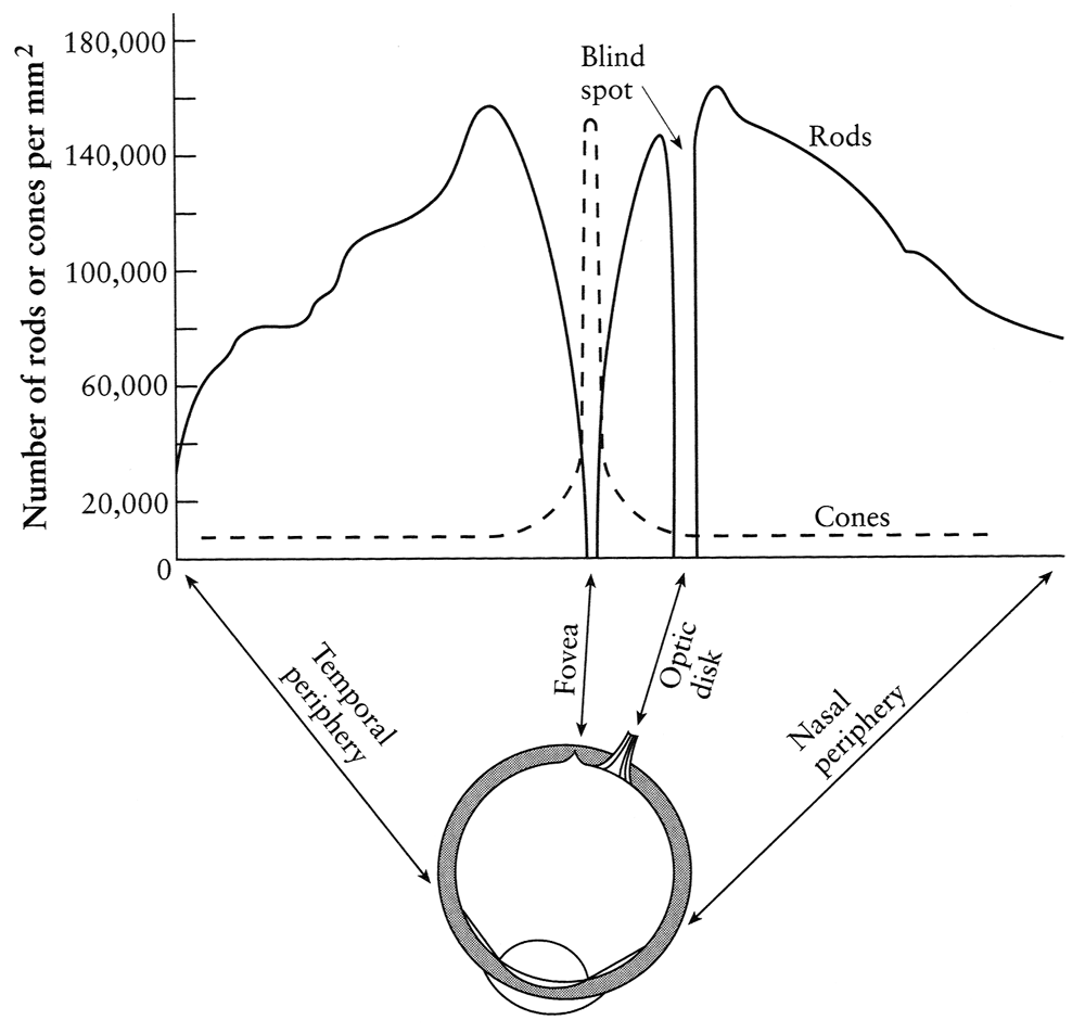 Rods와 Cones는 망막에 균일하게 분포되어 있지 않습니다.