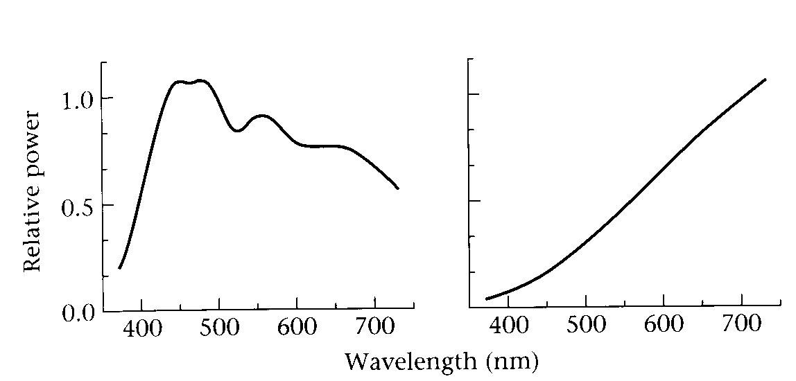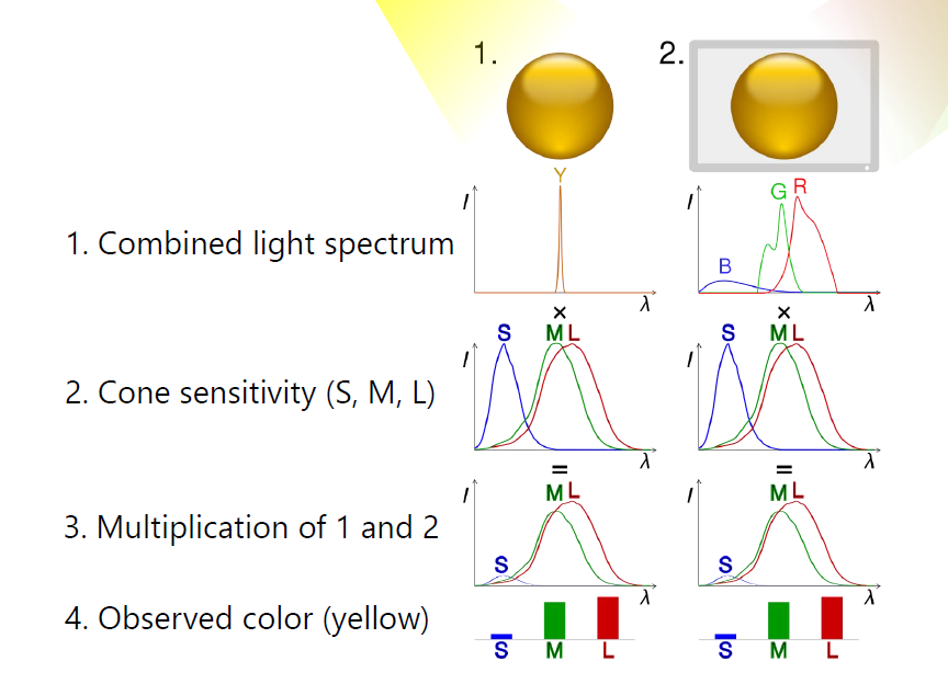결과적으로 두 개의 다른 스펙트럼이 구별할 수 없는 것처럼 보일 수 있고, 이러한 스펙트럼을 metamers라고 합니다.