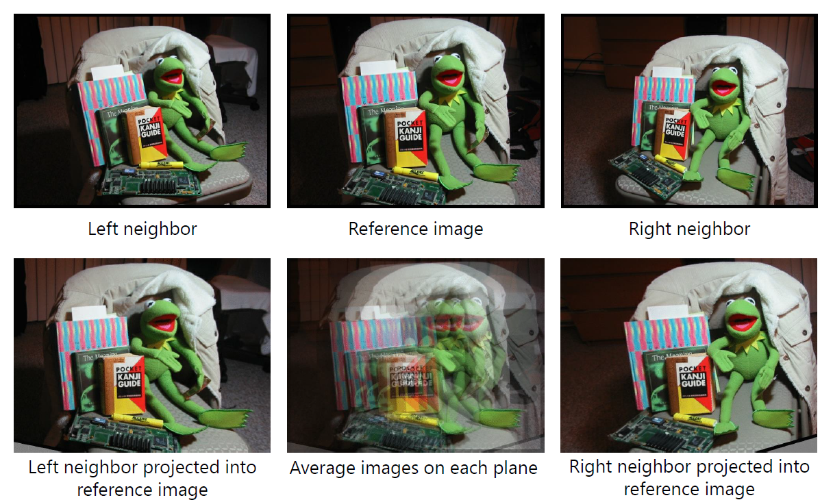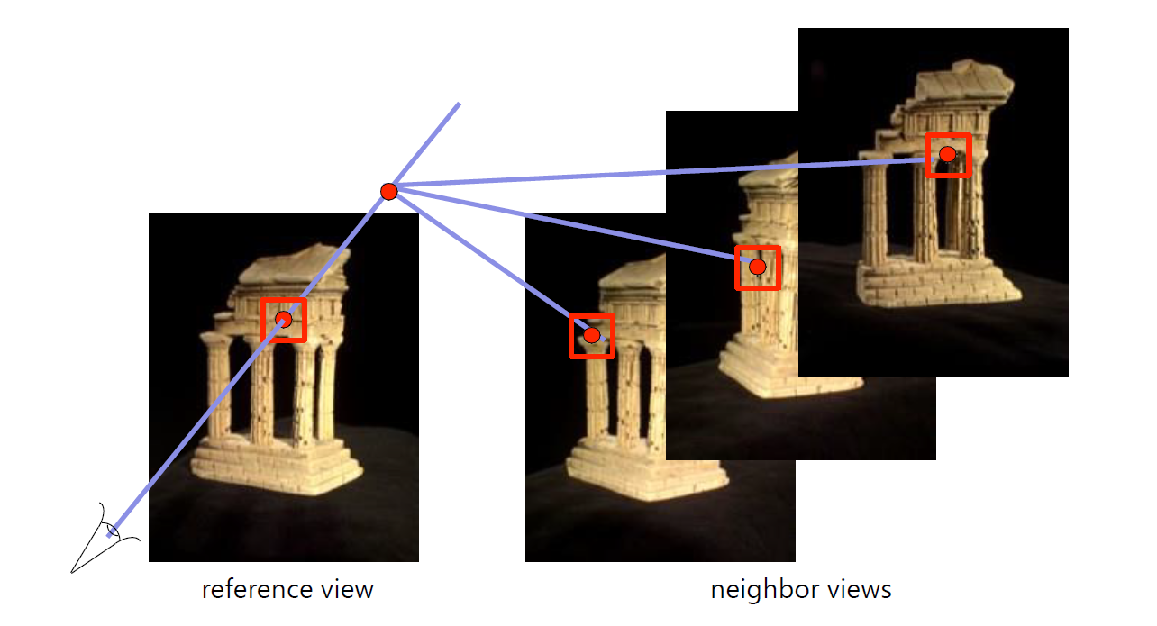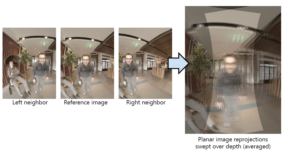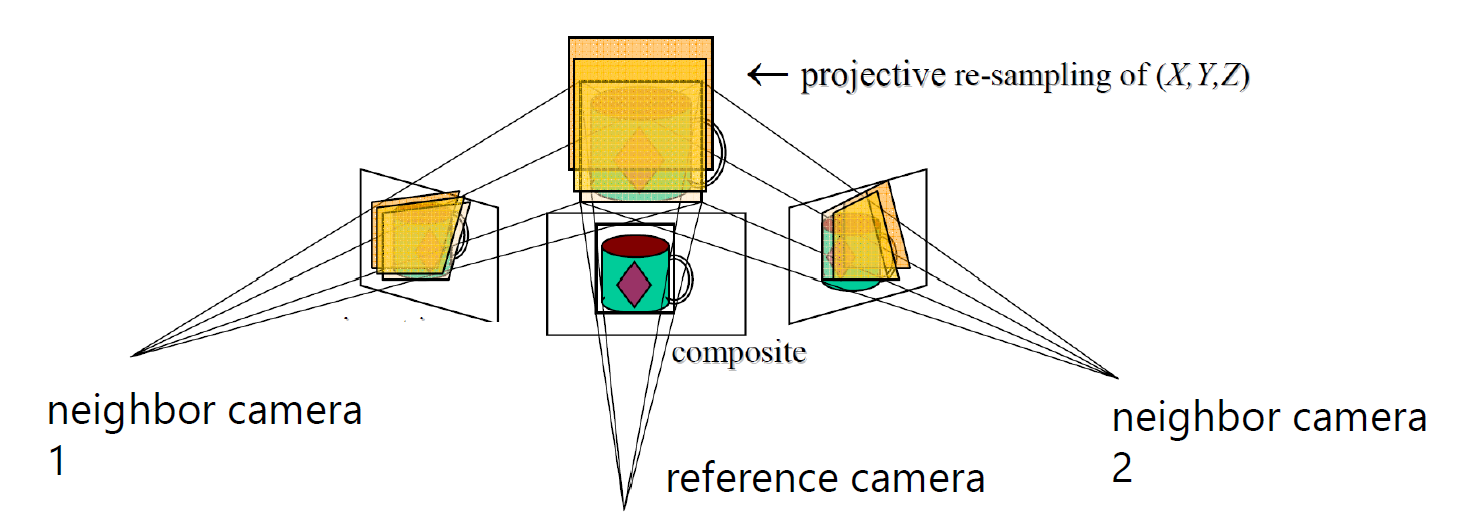 reference camera image plane에 평행한 plane의 family를 sweep합니다. 그리고 homography를 통해서 각 plane 위에 neighbors을 재투영하고 reprojections을 완성합니다.