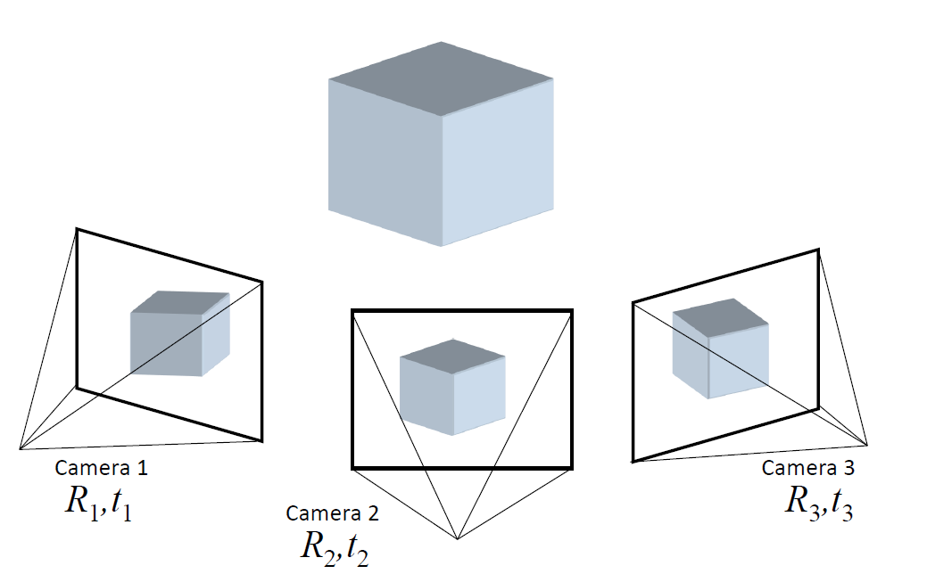 - Input: 몇몇의 viewpoints들로부터 교정된 이미지(known intrinsics, extrinsics, projection matrices)