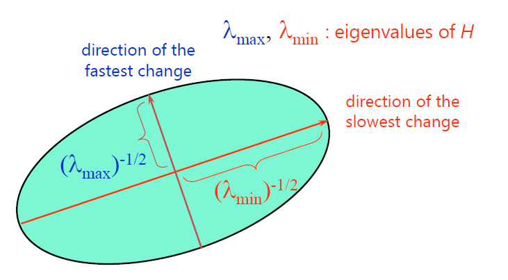 We can visualize $H$ as an ellipse with axis lengths determined by the eigenvalues of $H$ and orientation