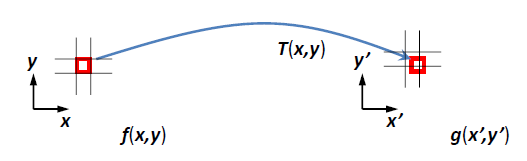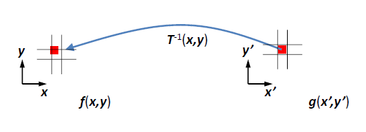 - Send each pixel $f(x)$ to its corresponding location $(x^\prime,y^\prime) = T(x,y)$in $g(x^\prime,y^\prime)$