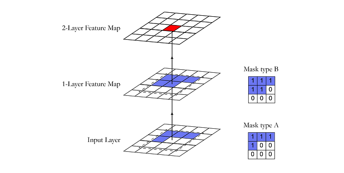 1. 첫 번째 컨벌루션 레이어에만 적용됩니다. 마스크의 중앙 픽셀을 0으로 설정하여 관심 픽셀에 대한 액세스를 제한합니다. 이런 방식으로 모델이 예측하려는 픽셀(아래 그림에서 빨간색)에 액세스하지 않도록 보장합니다.