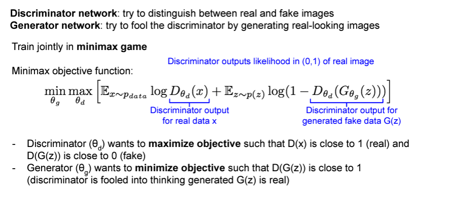 $는 Discriminator $와 Generator $간의 Value Function입니다. Discriminator는 이 함수를 최대화하려고 하며, 반면 Generator는 최소화하려고 합니다.