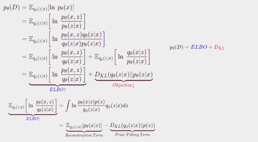 - $ \text{ELBO} = \mathbb{E}_{q_{\theta}(z|x)}[\log p_{\theta}(x|z)] - \text{KL}[q_{\theta}(z|x) || p(z)] $