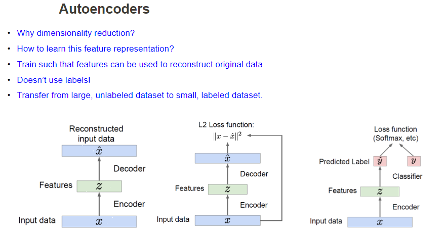 - Auto-Encoder는 1번으로 $z$를 생성하고, 2번으로 $\hat{x}$ 를 생성해서 최종적으로 $x$와 $\hat{x}$ 차이를 최대한 줄이도록 feature $z$를 학습합니다. 따라서 no labels! $x$와 $\hat{x}$ 만 필요!!