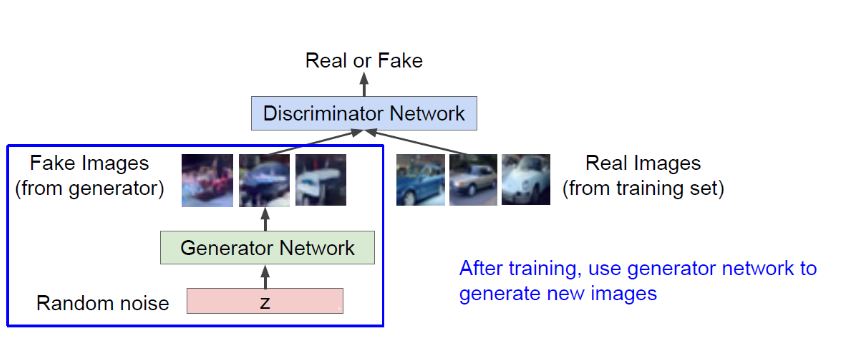 - GAN의 Generator: GAN에서는 Generator가 주어진 잠재 공간의 랜덤 벡터 $ 에서 가짜 데이터를 생성하는 역할을 합니다. 특히, 훈련이 완료된 후에는 Generator는 실제 데이터와 유사한 이미지나 데이터를 생성할 수 있습니다. 따라서 test time에는 Generator만 활용하여 원하는 수의 가짜 데이터 샘플을 생성할 수 있습니다.