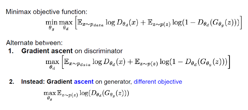 결과적으로, 이 두 목표를 동시에 달성하기 위해 Gradient Ascent 방법을 사용하여 Generator와 Discriminator를 번갈아가며 학습시킵니다. Discriminator를 먼저 학습한 후에는 Generator를 학습시키며, 이러한 과정을 반복하면서 두 모델을 균형 상태로 이끌어가게 됩니다. 이러한 균형 상태에서는 Generator가 실제 데이터와 유사한 가짜 데이터를 생성하게 되며, Discriminator는 두 종류의 데이터를 정확하게 구별하게 됩니다.