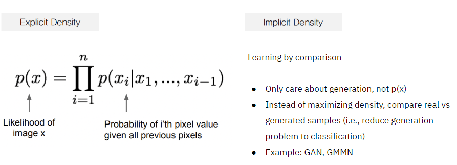 위에 장점만 보면 loss도 계산할 수 있는 explicit model이 훨씬 유리한 방법같아보일 수 있지만, 모델을 정의하는게 한계가 존재합니다. 데이터가 더 복잡해질수록 분포를 식으로 표현해서 계산하기 어렵기 때문에 implicit model 쪽을 많이 택합니다.
