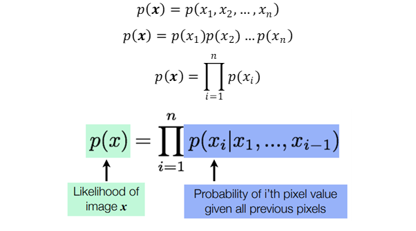 정리하면 Pixel RNN/CNN은 이전 sequence를 사전확률분포로 바로 다음에 있을 한 target(e.g 픽셀, 음정)을 생성하는 autoregressive 모델입니다. 따라서 다음 추정할 target의 분포는 이전 time step에 있던 target들의 분포 간 곱으로 explicit & tractable하게 표현이 가능합니다.