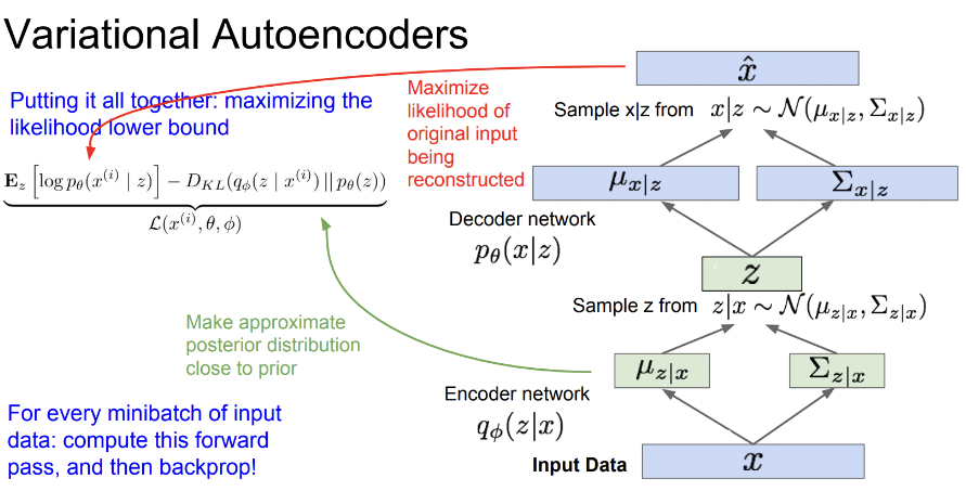 - Encoder $q_{\phi}(z|x)$ : $x$를 input으로 받아서 mean,covariance추출 후, $z$ space상에서 분포를 생성. $z$는 gaussian 분포를 따른다고 가정.