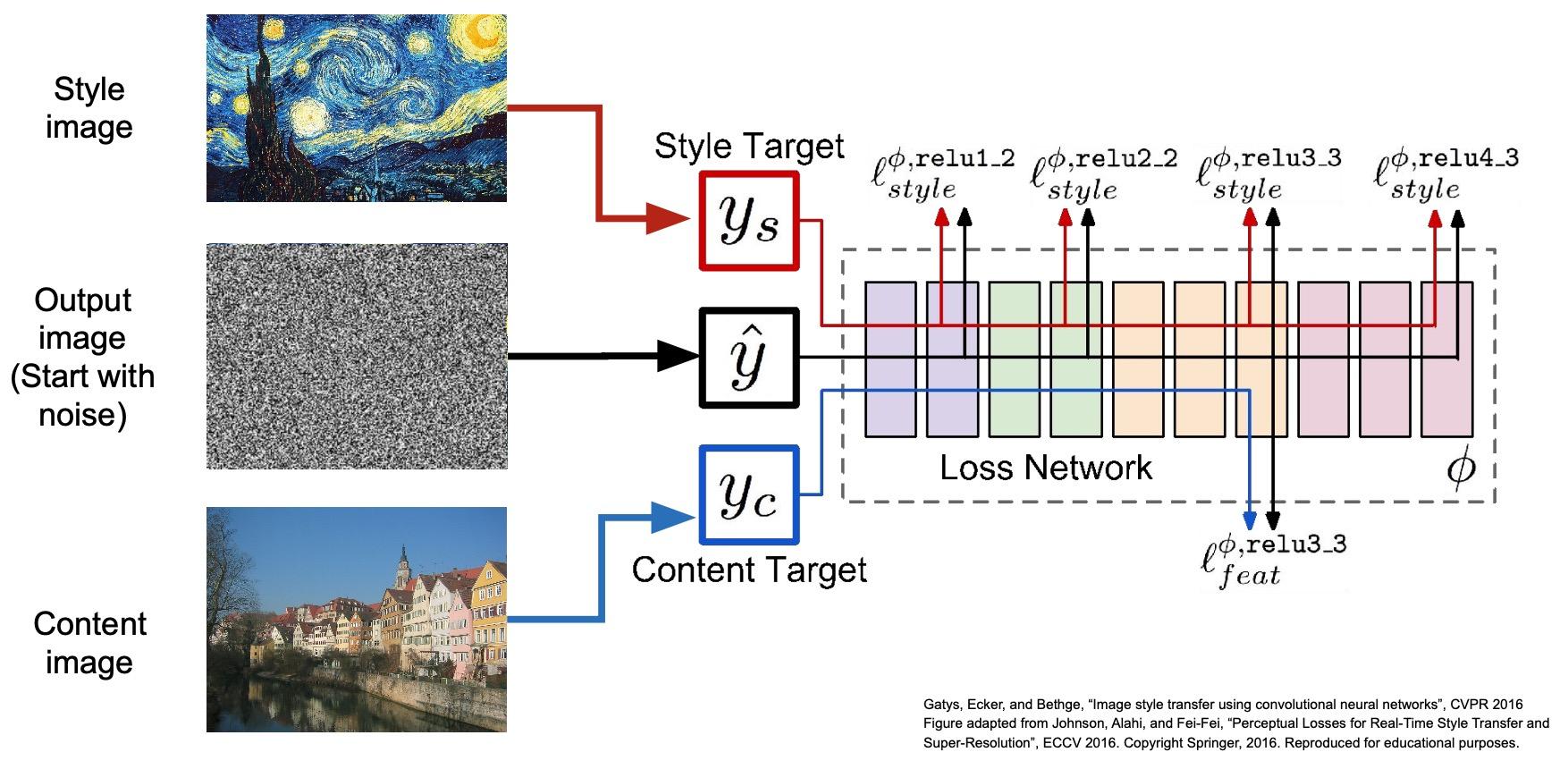 - 사전 훈련된 CNN(예: VGG)을 사용하여 이전과 유사한 그램 매트릭스 기반 손실을 계산합니다.