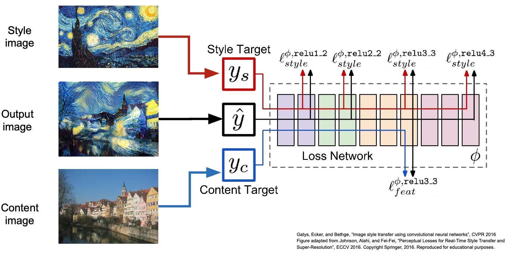 - 이것이 feed forward network라고 불리는 이유는 역전파 과정에서 자체 forward pass를 사용하여 역전파를 수행하지 않고 대신 미리 훈련된 네트워크의 순방향 패스를 사용 하여 손실을 계산하기 때문입니다.