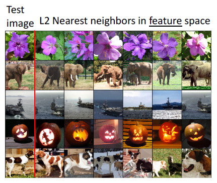 - 다만 픽셀 공간에서 Nearest neighbors를 계산하는 것이 아니라 CNN에서 나온 4096 dim의 feature vector 공간에서 계산합니다.