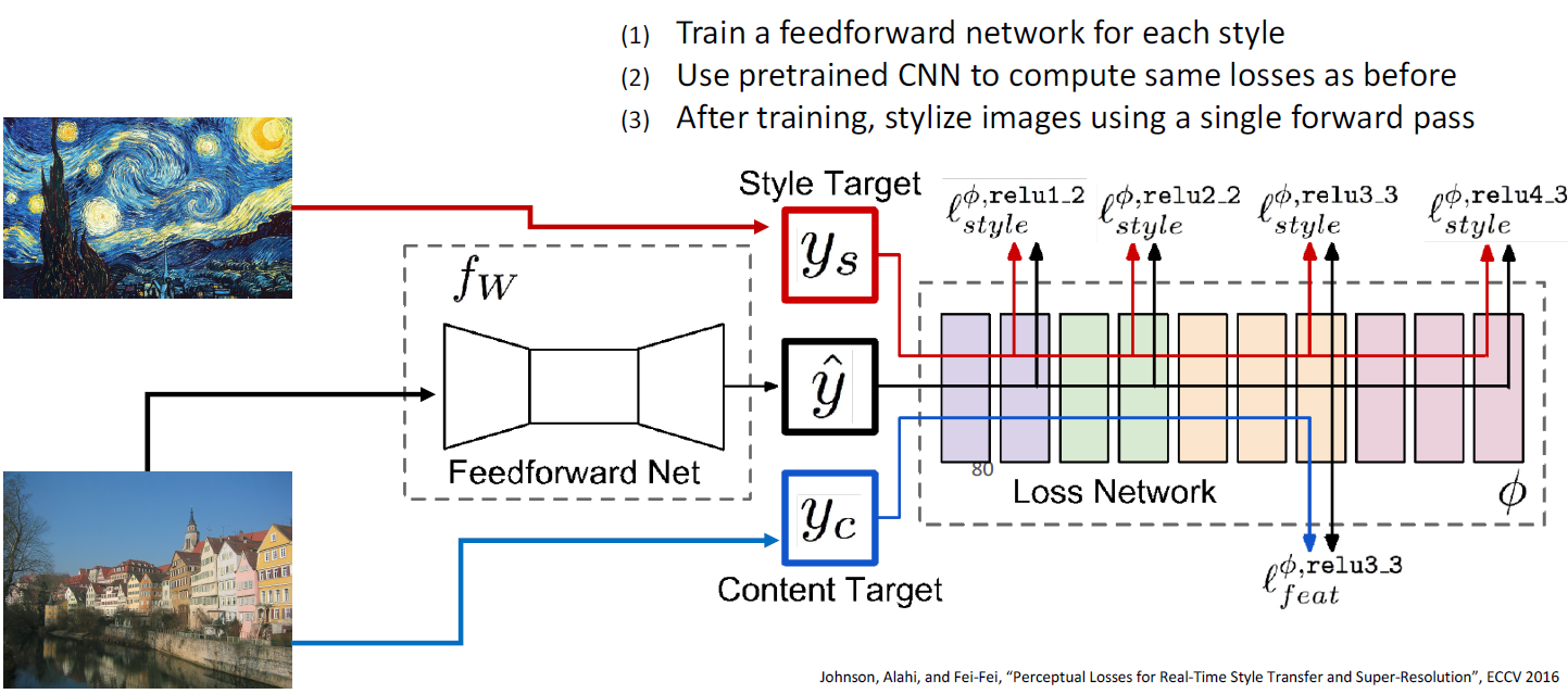 - Problem: Style transfer requires many forward / backward passes through VGG; very slow!