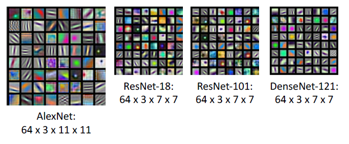 - 그리고 순서대로 AlexNet, ResNet-18, ResNet-101, DenseNet-121의 첫 번째 Conv filter의 가중치들입니다.