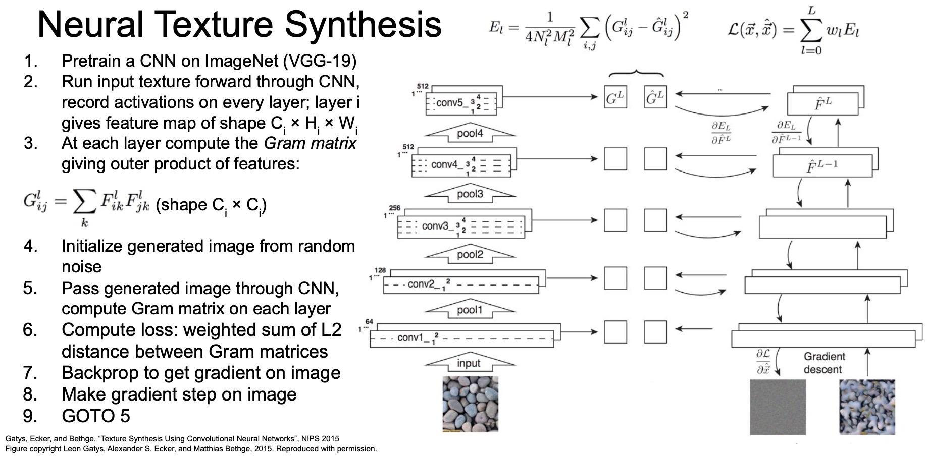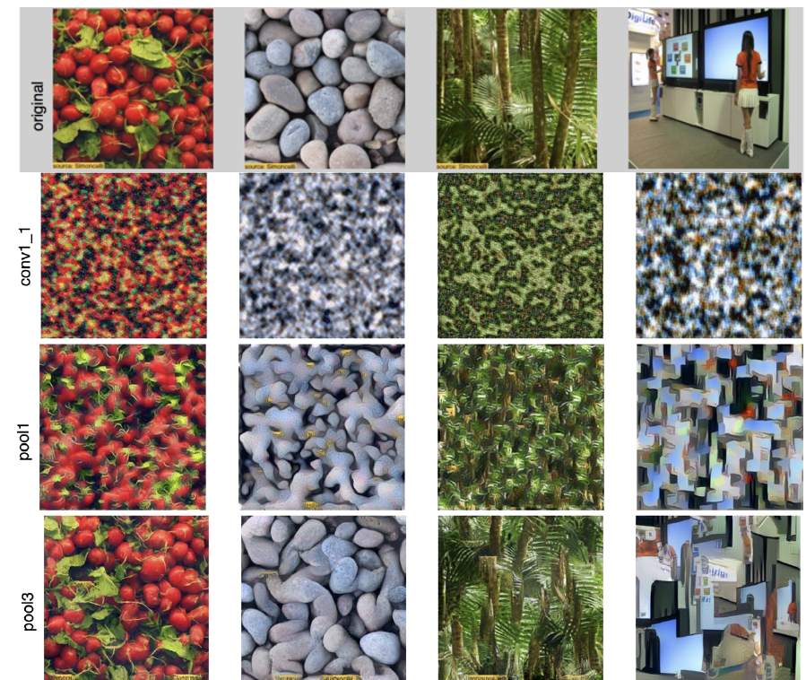 - Reconstructing texture from higher layers recovers larger features from the input texture
