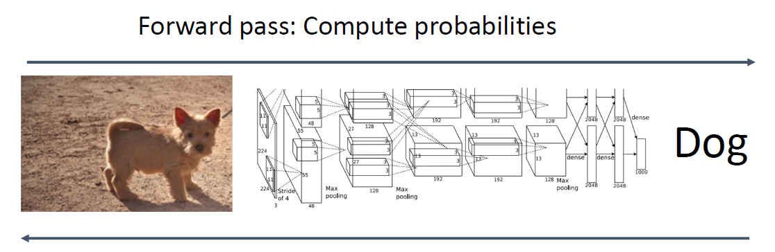 CNN의 한쪽에서는 입력 이미지가 들어가고, Conv layer를 거치면서 아주 다양한 변환을 거칩니다. 결국 CNN의 출력 값은 우리가 이해하고 해석할 수 있는 class score의 형태로 나옵니다. 이뿐만 아니라 bounding box의 위치, labeled pixels와 같은 형태의 출력도 있습니다.