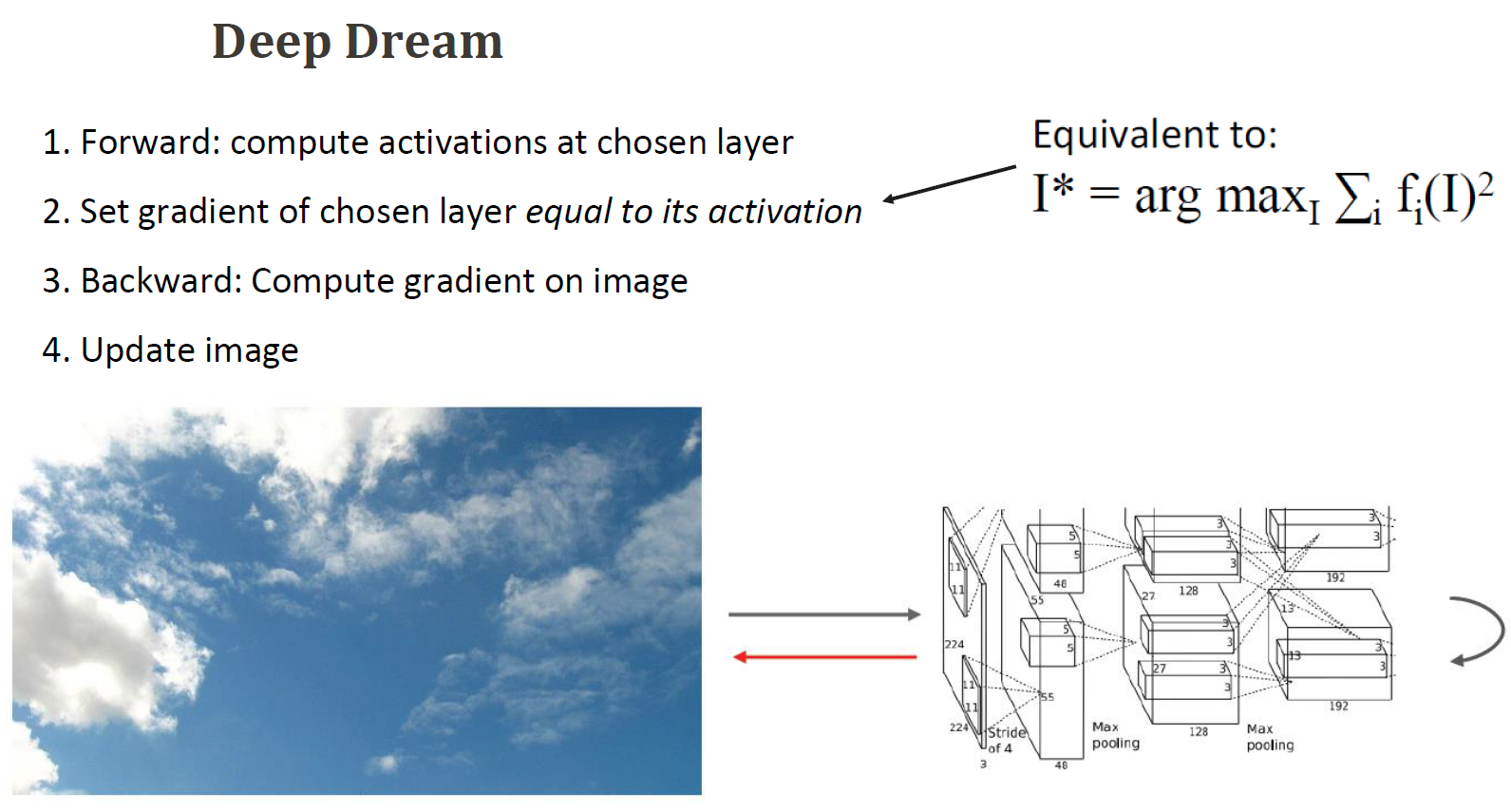 - Input an image generated using a random noise vector to a network pre-trained on ImageNet (the original paper used VGG).
