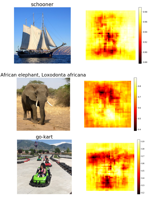 - CNN에 넣기 전에 이미지의 일부를 masking하고 mask 위치에서 이 이미지를 예측한 확률의 히트맵을 그립니다.