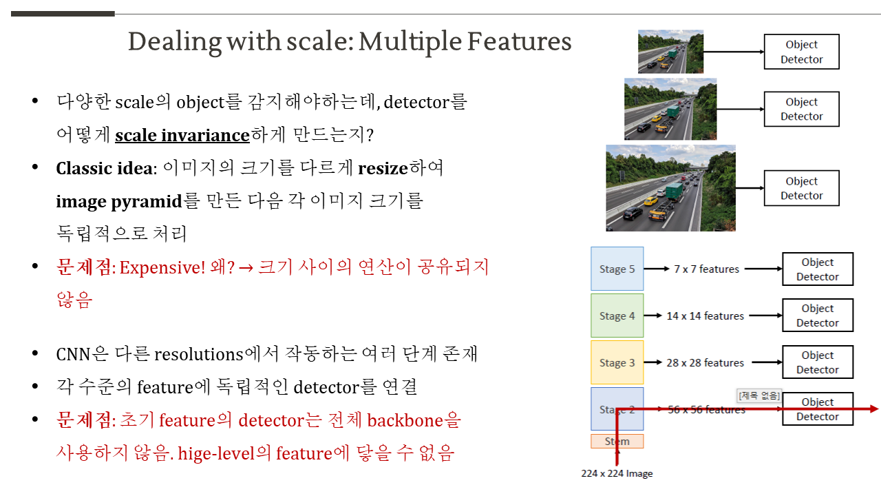 다양한 규모의 객체를 detection하는 것은 특히 작은 object의 경우 어려운 일입니다. 이를 위해 동일한 이미지의 피라미드를 서로 다른 축척으로 사용하여 객체를 detection 할 수 있습니다. 그러나 여러 스케일 이미지를 처리하는 데는 시간이 많이 걸리고 메모리 요구량이 너무 높아 종단 간 동시에 훈련할 수 없습니다.