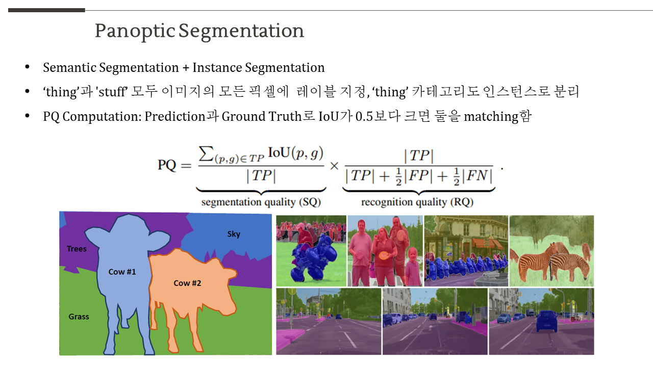 그리고 metric으로 PQ Computation이 제안됩니다. Prediction과 Ground Truth로 IoU가 0.5보다 크면 둘을 matching하는 방법입니다.
