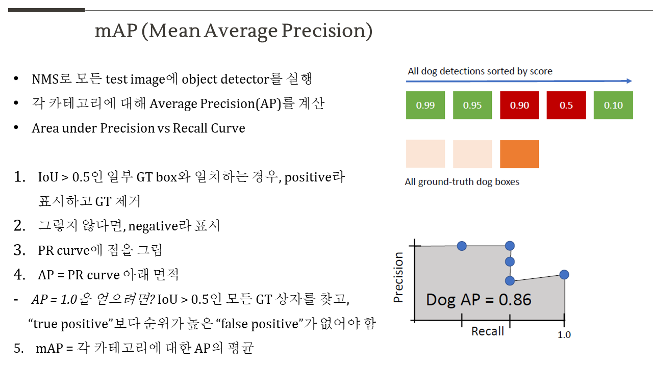 mAP는 Mean Average Precision으로 PR 곡선에서 아래 영역을 의미합니다.