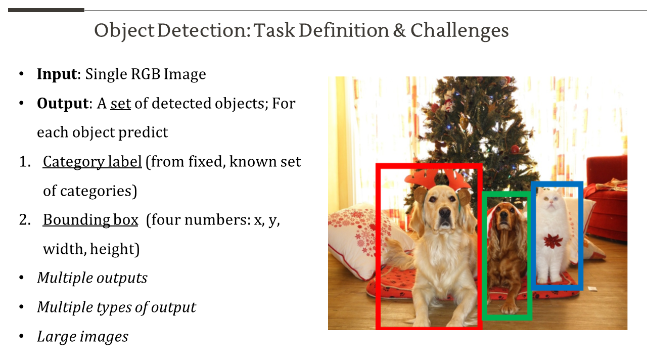 Detection의 문제로는 이미지 안에 객체가 하나가 아닌 여러 개라는 점입니다.