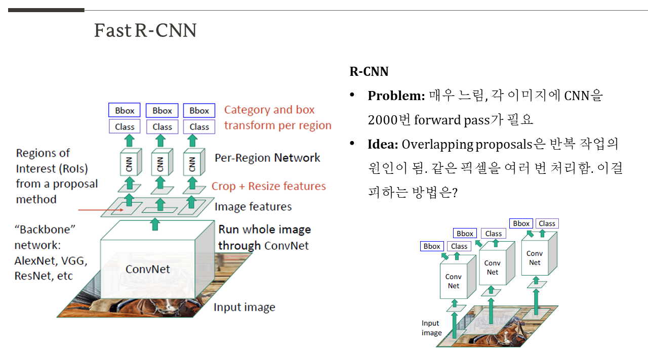 왜 더 'Fast' 할까요? 대부분의 계산은 아래 Backnone network에서 일어나는데, 전체 이미지를 바로 CNN에 통과 시키면 오버랩 된 region proposals에 대해 반복적으로 계산할 필요없이 한번 계산하면 끝나기 때문입니다.