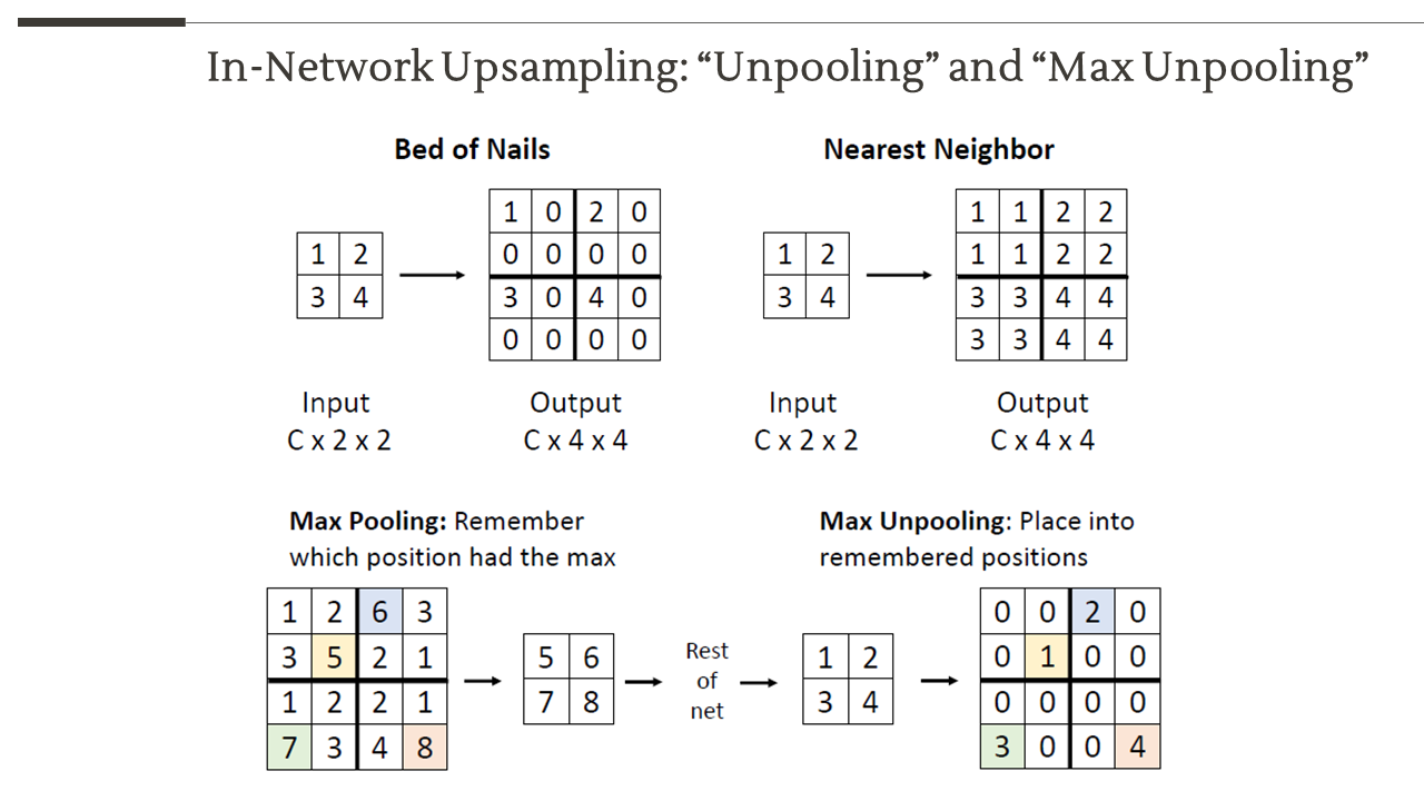 1. Bed of Nails은 Unpooling 영역에만 값을 복사하고 나머지는 0을 채우는 방법입니다.